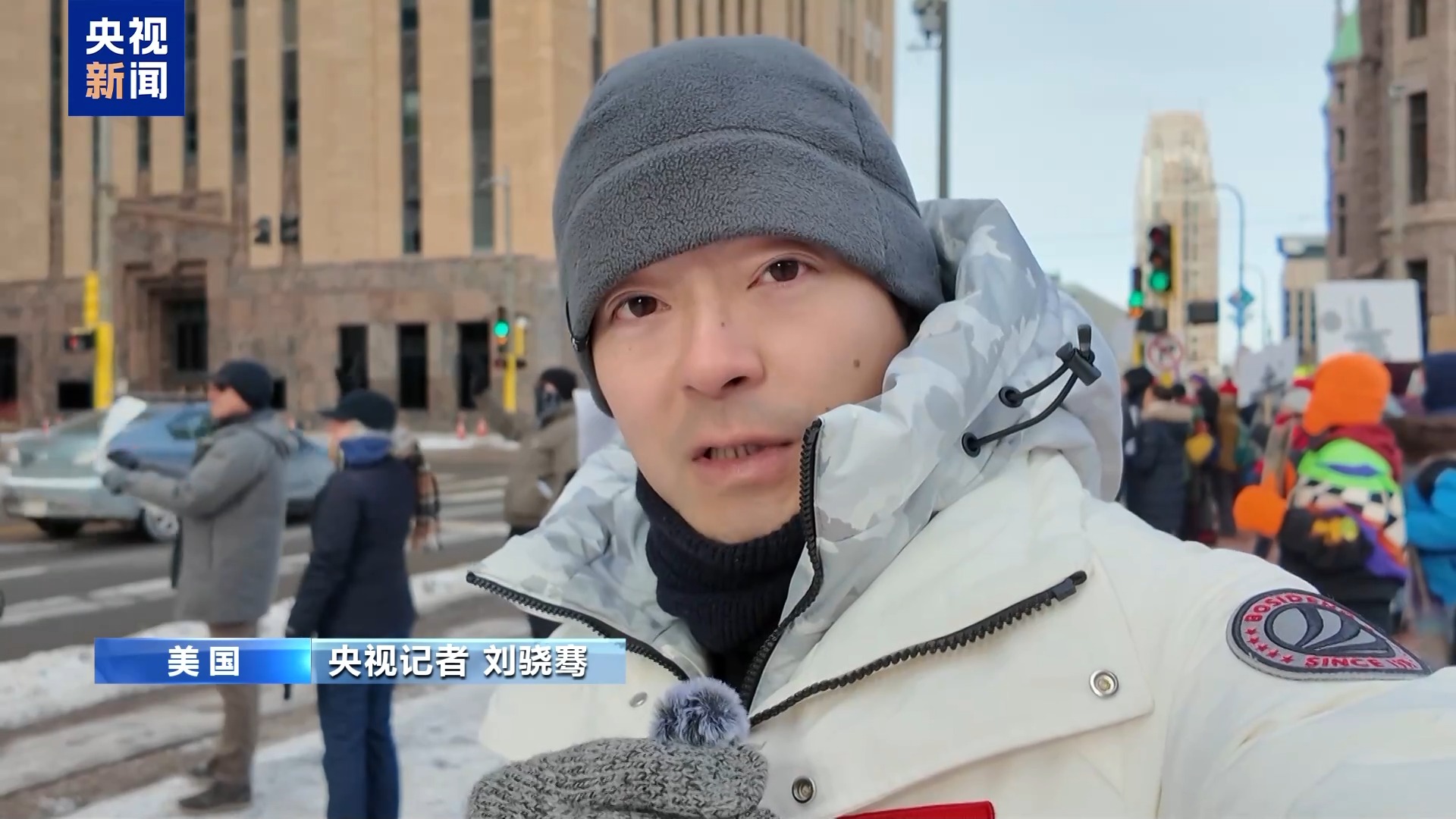央视记者 刘骁骞:这里是明尼阿波利斯市的市中心,虽然当地的极寒天气延续,但是依然有很多民众走上街头,以此来响应当地时间20日全国性的抗议活动。