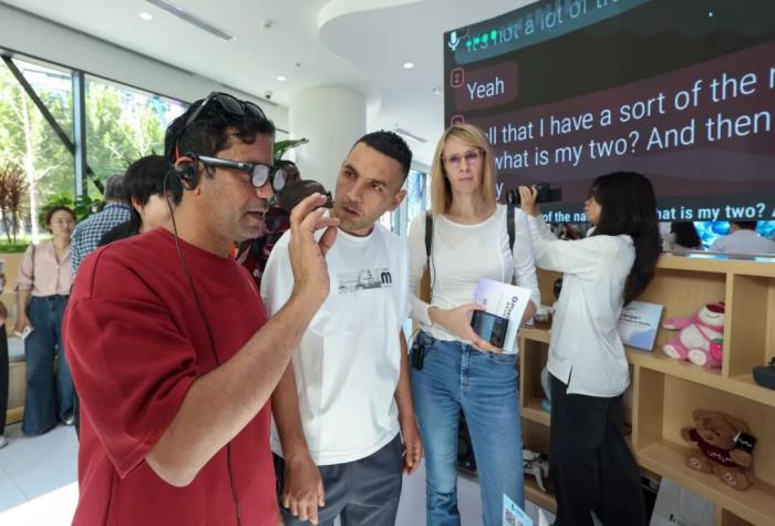 2025年9月29日,在“外国记者走进北京”——经开区专题推介活动上,外国记者佩戴自动翻译眼镜。中新社记者 贾天勇 摄