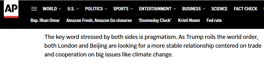 报道说,英中双方强调的关键词是“务实”。随着美国搅动世界秩序,伦敦和北京都在寻求一种以贸易和气候变化等重大问题合作为中心的更稳定关系。