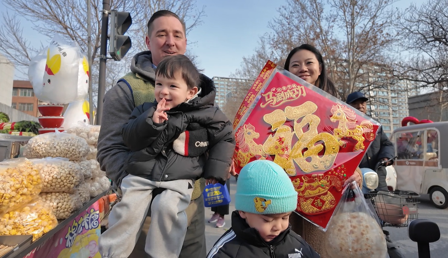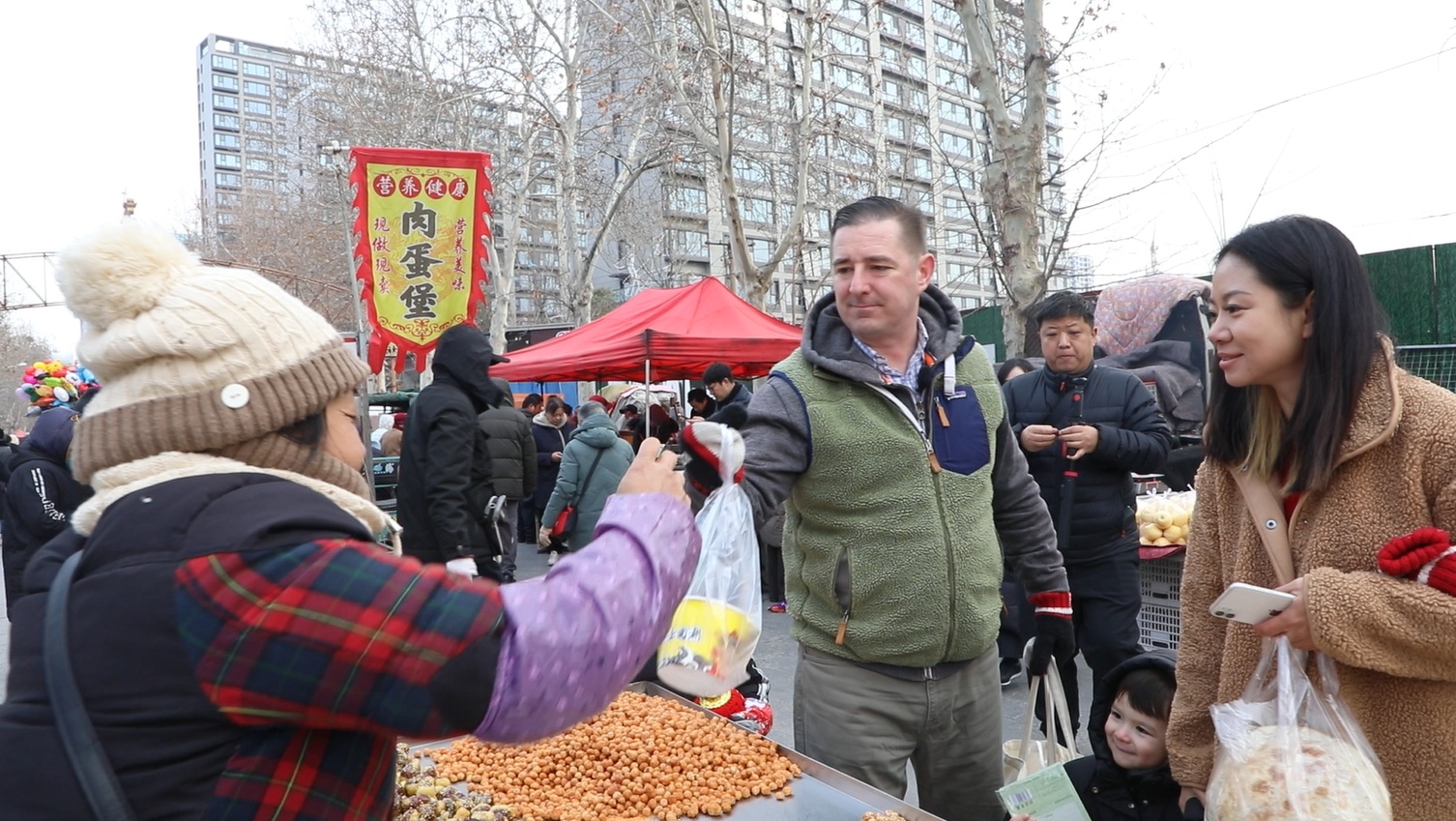 阿德里安:中国春节很有趣,它真的很活泼、很温暖。你看,大集上的小贩们对我的孩子都很好。这是我喜欢待在这里的原因之一。这是我们作为一个家庭喜欢的事情之一——走出去,脚踏实地,四处走动,成为人群中的一员。