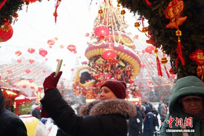 当地时间2月16日,中国农历除夕,第三届莫斯科“欢乐春节”活动在莫斯科市中心隆重启幕。图为俄罗斯民众在活动现场拍照打卡。 中新社记者 田冰 摄