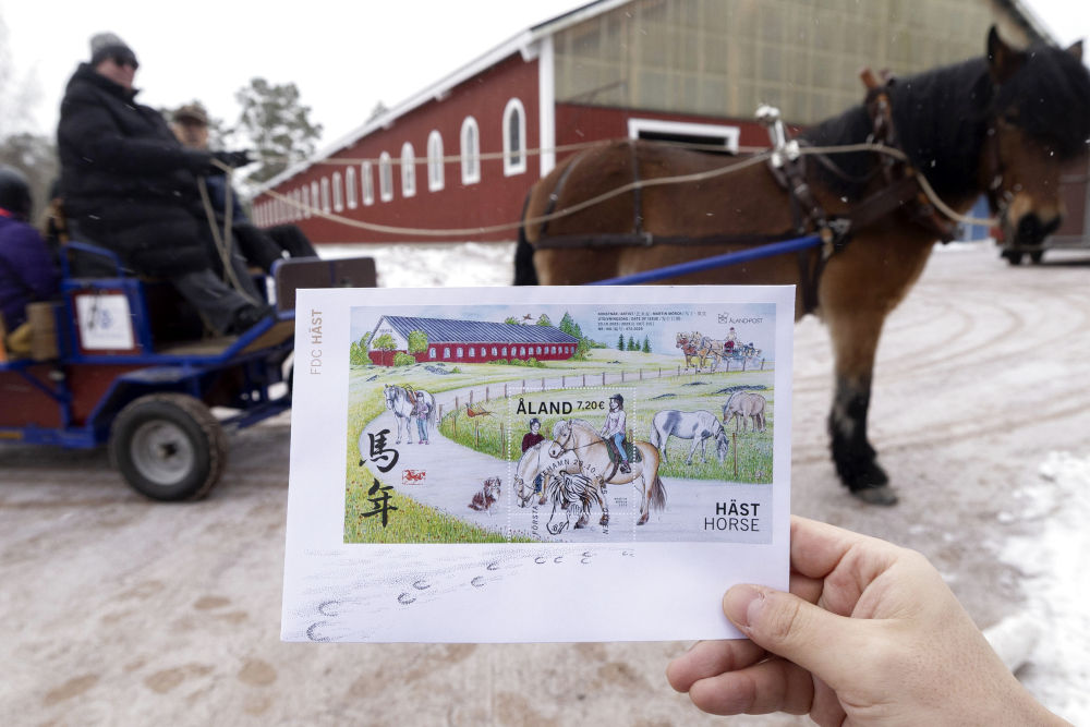 在马年邮票“小型张”画面上,芳草萋萋,野花盛开,数匹骏马参差排布,或低头吃草,或拉车而行,或与人亲昵;稍远处,红墙青瓦的房舍掩映于绿树之间,一派别具奥兰群岛特色的田园景象。