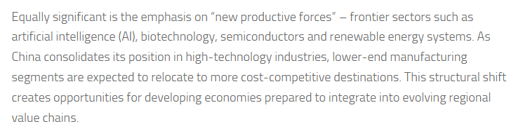 文章分析说,全国两会对“新质生产力”这一核心议题的聚焦,同样意义深远。前沿领域包括人工智能、生物技术、半导体以及可再生能源系统等。随着中国在高科技产业中的地位日益巩固,这种结构性转变带来的产业转移,为那些准备融入区域价值链的发展中经济体创造了机会。