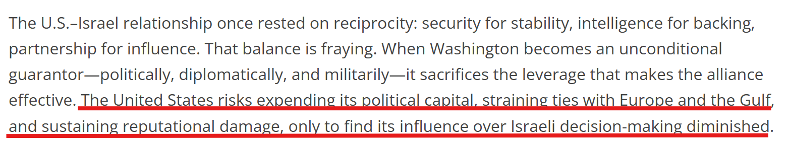 文章说,美以关系曾建立在互惠基础上:安全换稳定、情报换支持、伙伴关系换影响力。这种平衡正在瓦解。当华盛顿成为在政治、外交和军事上的无条件担保者,它便牺牲了使联盟有效的杠杆力。美国正冒险消耗其政治资本,疏远与欧洲和海湾国家的关系,并承受声誉损害,结果却发现自己对以色列决策的影响力不增反减。