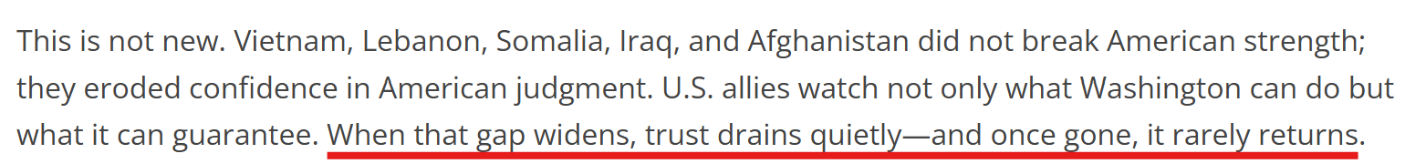 文章称,美国的实力依然强大,但实力不等于掌控力。过去的越南、黎巴嫩、索马里、伊拉克和阿富汗战争并未击垮美国的实力,但它们却动摇了世界对美国判断力的信心。美国的盟友关注的不仅是华盛顿能做什么,还有它能承诺什么。当承诺与实力的鸿沟扩大,信任便悄然流失——而信任一旦崩塌,往往难以重建。