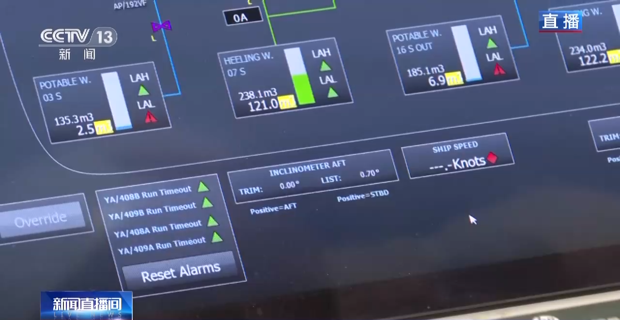 总台记者 盛瑾瑜:这个屏幕上显示了邮轮8个压载水舱的实时数据,正在调整的是7号横倾水舱,按照计划,63吨的压载水将从左侧驳到右侧。由此邮轮向右侧发生了轻微角度倾斜。在船上有三处13米长的摆锤,可以观测到微小的变化。