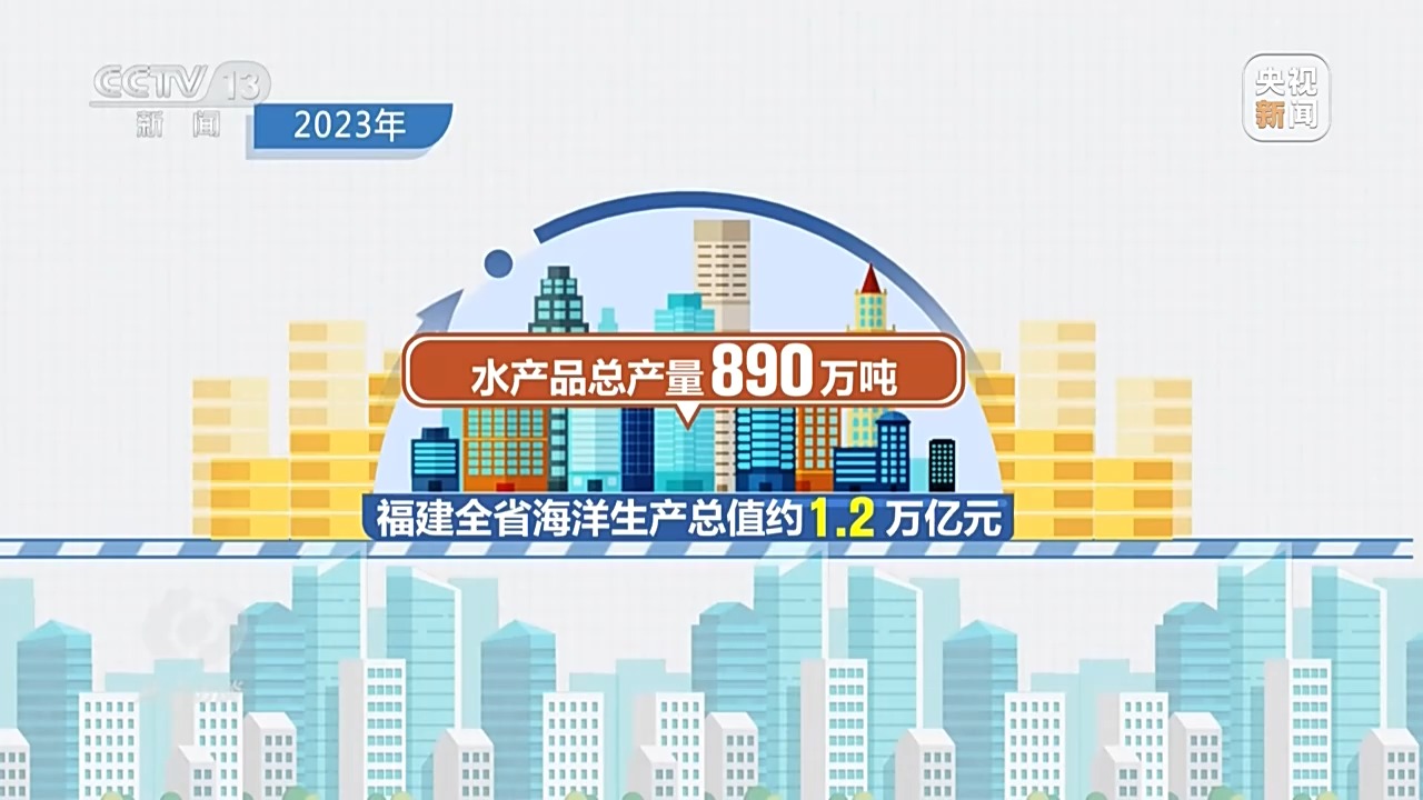 2023年,福建全省海洋生产总值约1.2万亿元,水产品总产量890万吨。其中,海水产品产量788万吨、占全国产量1/4,居全国首位;水产品人均占有量200余公斤,居全国首位;大黄鱼、鲍鱼、牡蛎、江蓠、海带、河鲀等养殖产量均居全国首位。