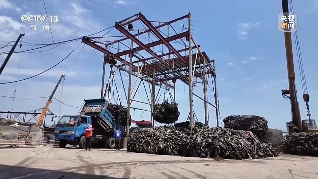 在筱埕镇官坞村码头,成吨的海带被吊起装在重型卡车上,运往加工厂。经过烫煮、冷却等多道工序后,这些海带将被制成各类食品,销往海内外。