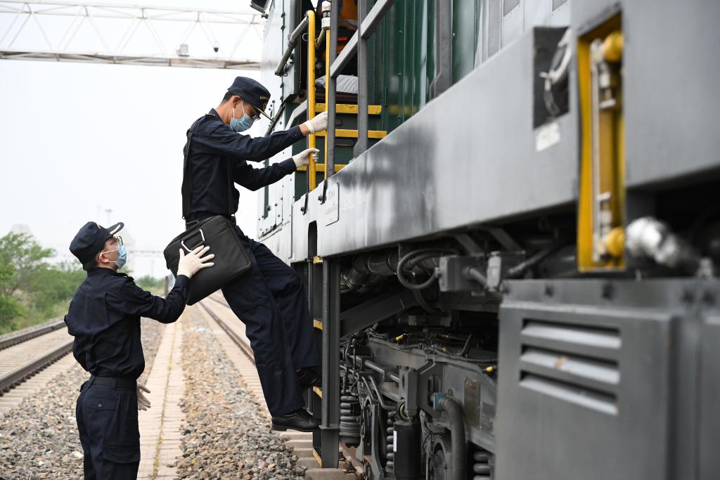 2024年7月17日,两名满洲里海关工作人员登上一列停靠在内蒙古满洲里铁路口岸的中欧班列货运列车检查。新华社记者 李贺 摄