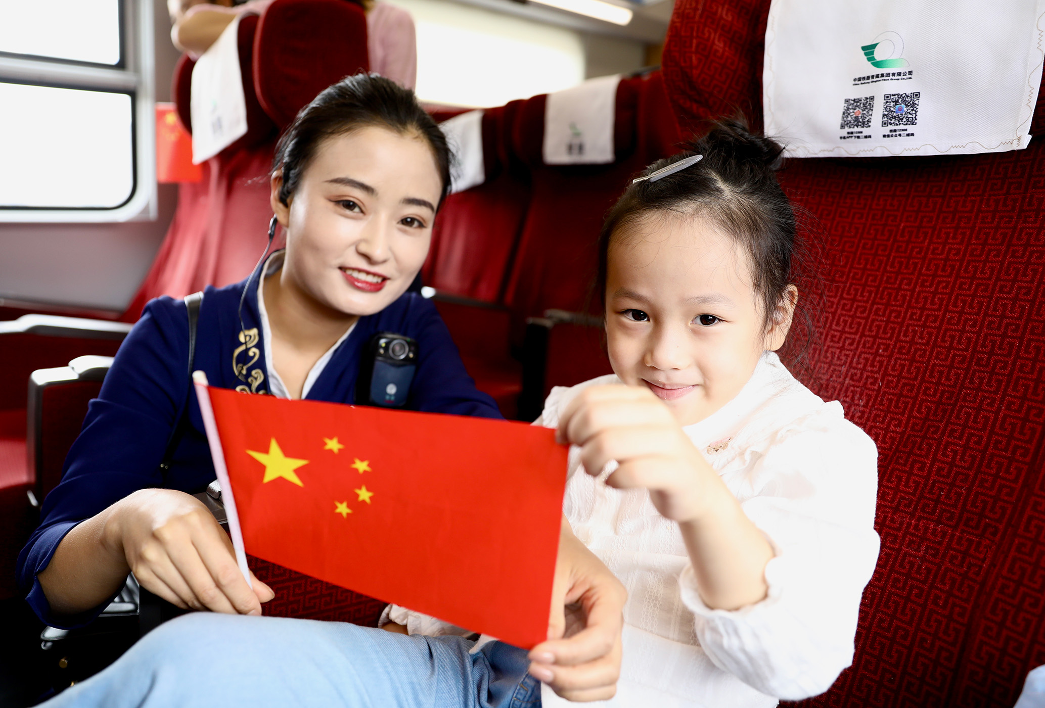 值得一提的是,值此新中国成立75周年之际,高原铁路人用自己独有的方式为祖国庆生。在海拔4000多米的天路之巅,线路“医生”们在晨曦初照时,顶着凛冽的寒风,庄严地唱起国歌、升旗国旗,让红旗展现在生命禁区。而在列车之上、车站之内,一幕幕温馨的画面也在接连上演,高原铁路人与旅客们挥舞起五星红旗,载歌载舞,共同祝福伟大祖国繁荣昌盛。在各个关键行车岗位值守的干部职工,把红旗插在手边,把责任放在心中,齐心协力守护铁路运输大动脉安全畅通。