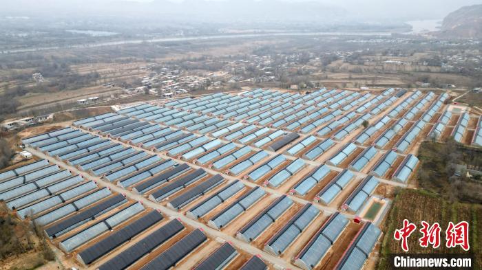 11月21日,航拍甘肃省积石山县大河家镇韩陕家村集中安置点后续产业——高效节能日光温室蔬菜大棚。九美旦增 摄