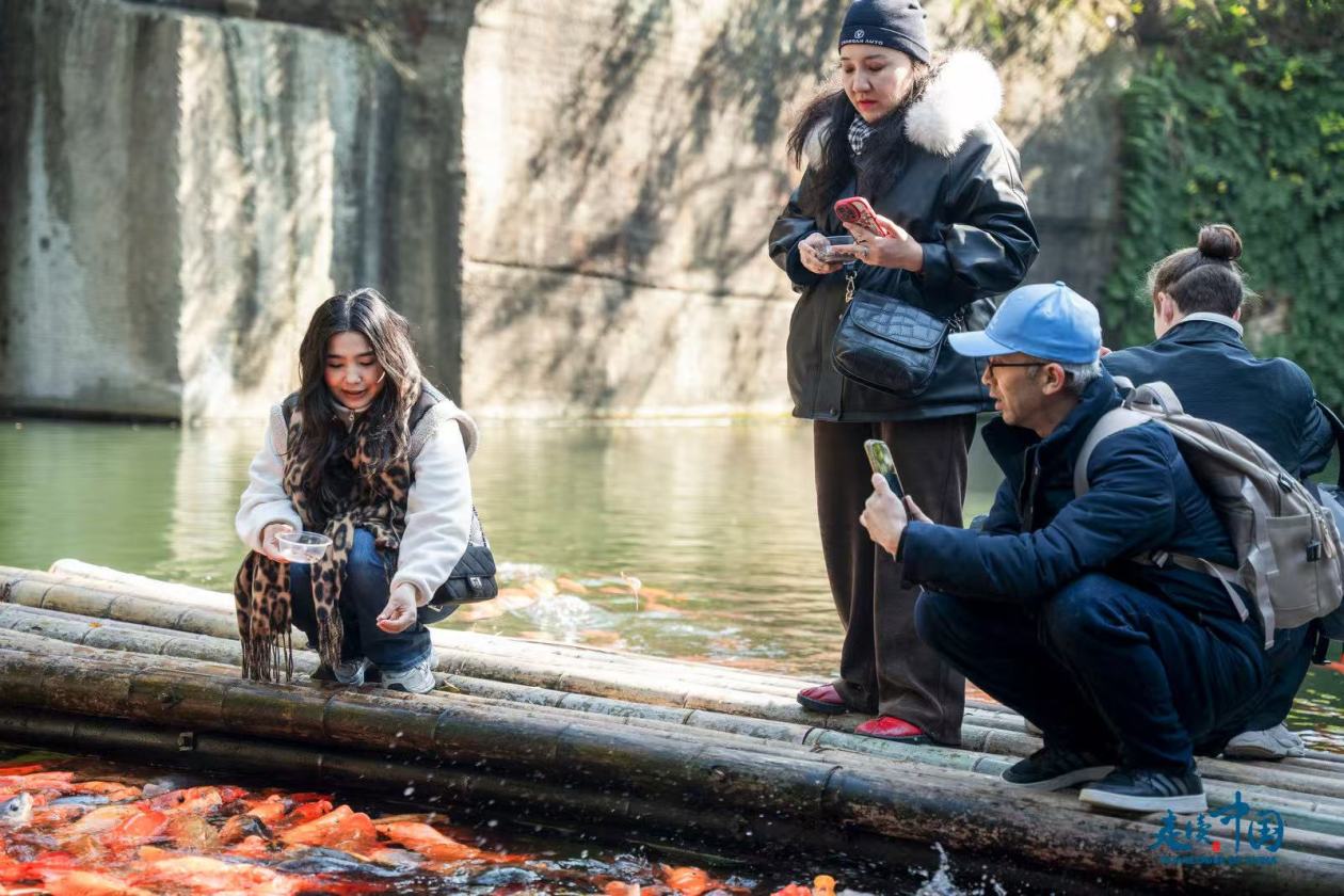 外国记者向锦鲤池许愿