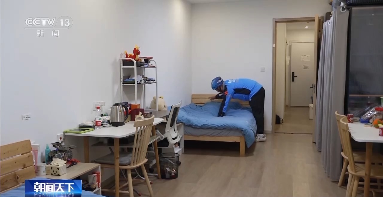 上海市普陀区外卖员 纵波:里面配套设施都是齐全的,冰箱、空调、洗衣机这些都是有的,我感觉到了国家对我们的新就业群体越来越关心和关爱。