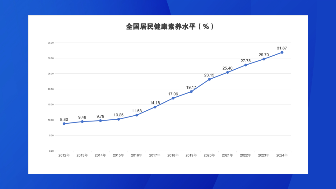 2024年我国居民健康素养水平达到31.87%,比2023年提高2.17个百分点,保持较快增幅。