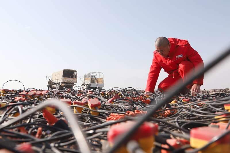 在施工现场,需要检测的无线节点仪器和检波器串摆成了一个巨大的圆形图案,李国忠和物探队员一起为这些仪器做“健康体检”。李国忠介绍,无线节点仪器稳定性高、便于携带,主要用在高难山体区。在沙漠区采用高精度可控震源,既保证了施工质量、提高了施工效率,也保护了生态环境,实现了绿色勘探。