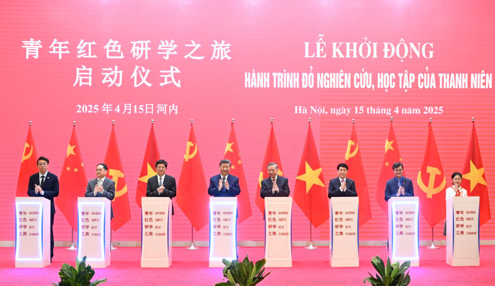 在全场期待的目光中,红色大屏幕字样更换。“5-4-3-2-1-开始!”两党两国领导人与双方代表共同按下按钮,启动“红色研学之旅”项目。灯光闪耀,两国青年探索友好历史、携手互学互鉴之路延展向前。