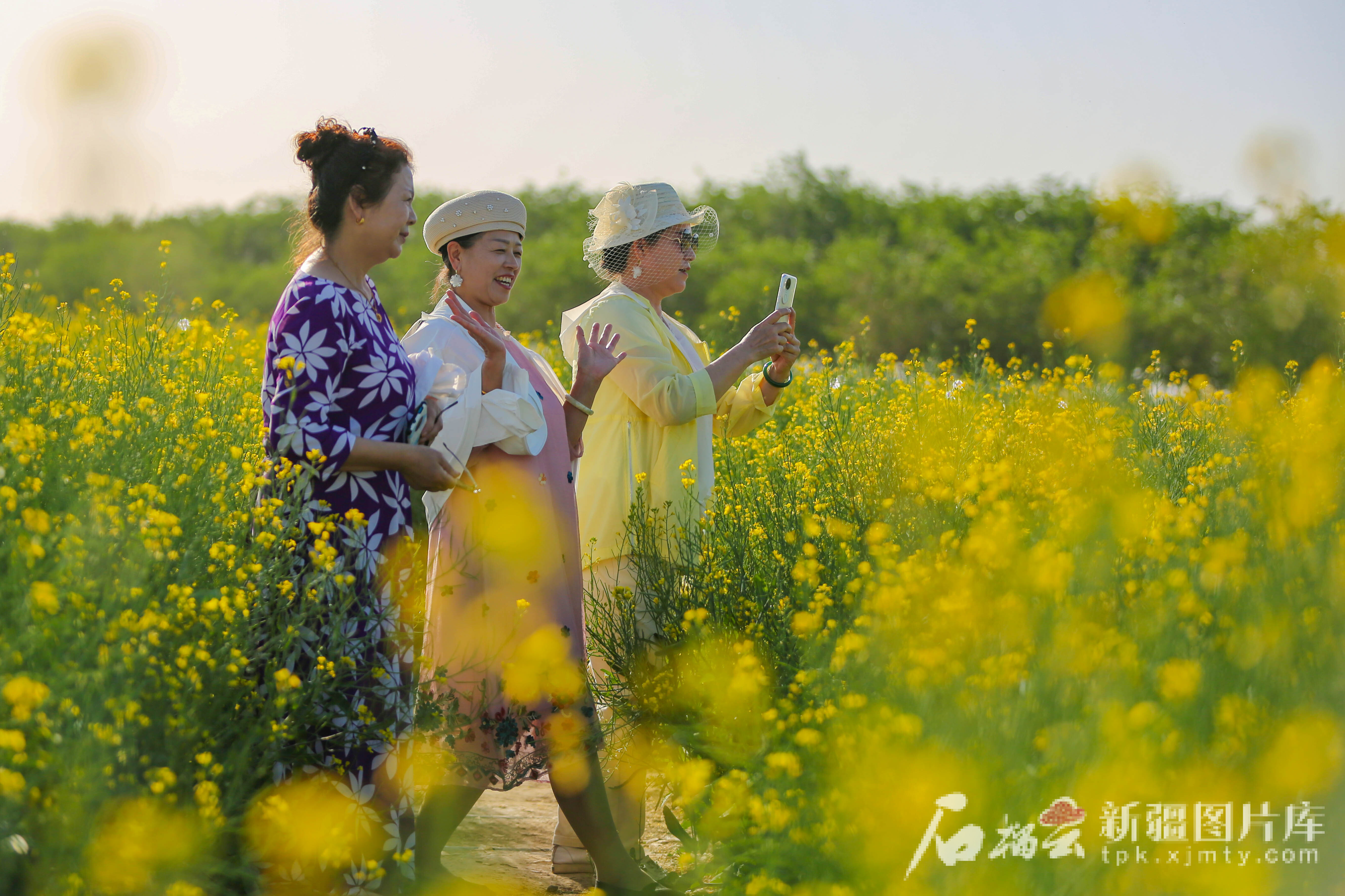 5月9日,游客在昌吉市六工镇十三户村千亩油菜花田景区拍照。