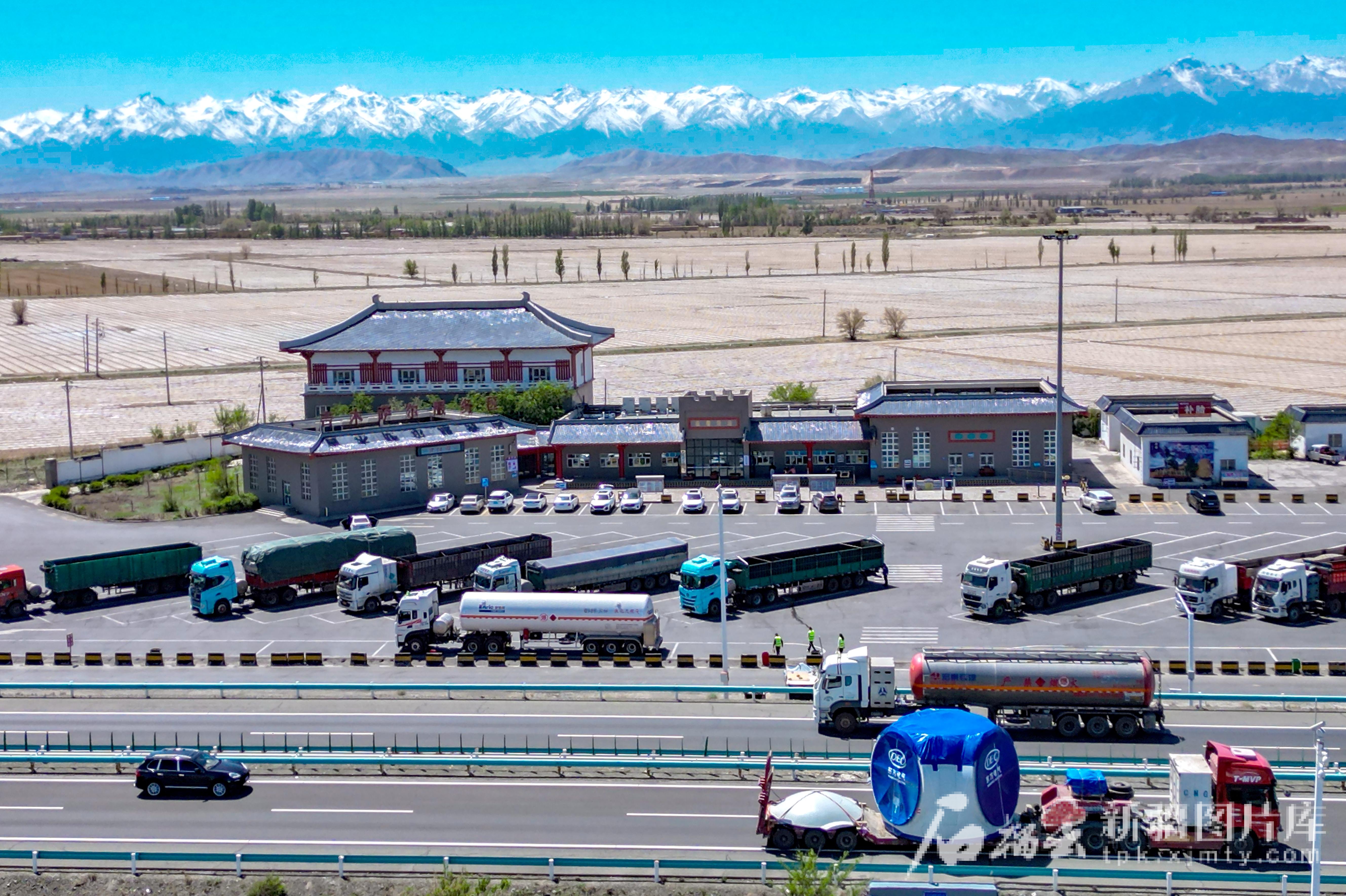 5月9日,京新高速吉木萨尔服务区,车辆在服务区停靠。