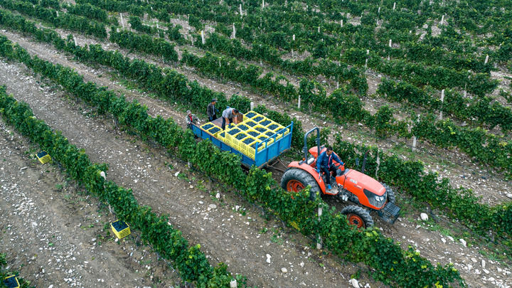 工人在宁夏沃尔丰酿酒葡萄种植基地转运采摘下的酿酒葡萄(2024年9月19日摄,无人机照片)。新华社记者 王鹏 摄