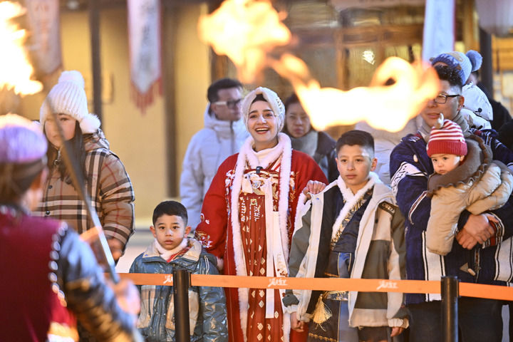 外国友人在“漫葡·看见贺兰”沉浸式演艺小镇内观看演出(2025年1月14日摄)。新华社记者 王鹏 摄