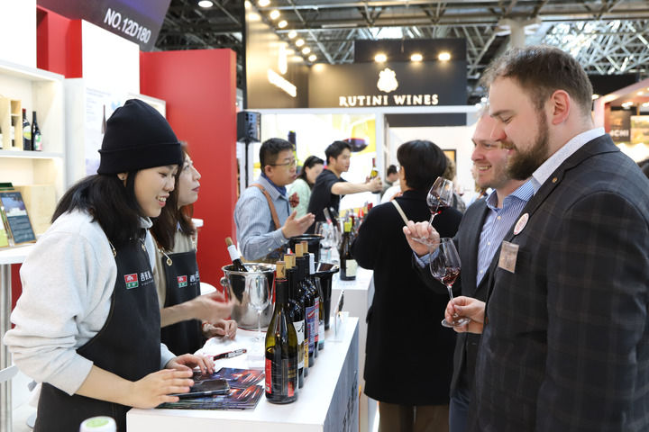 在德国杜塞尔多夫举行的2025年杜塞尔多夫葡萄酒与烈酒展上,参观者品尝中国宁夏产区的葡萄酒(2025年3月16日摄)。新华社记者 刘向 摄