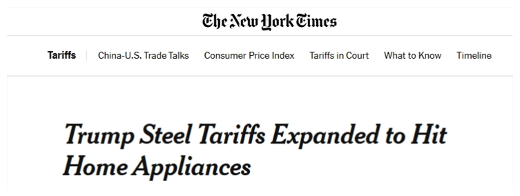 家用电器行业也未能幸免。据《纽约时报》12日报道,美国商务部当日表示,洗衣机、冰箱及其他使用钢铁部件的常见家用电器很快将面临加征关税。对大多数国家设定的所谓“钢铁衍生产品”关税将于6月23日生效,税率为50%,新关税将按每种进口产品的钢铁含量价值征收。