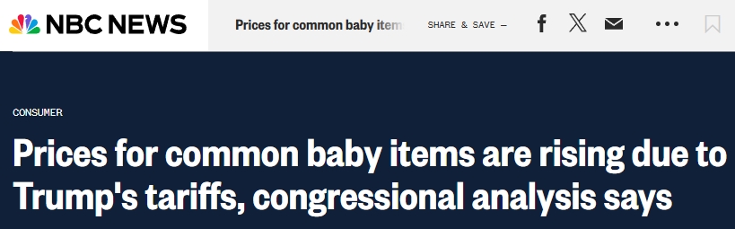 婴儿用品同样面临“涨价潮”。美国全国广播公司新闻网站(NBC News)援引国会联合经济委员会少数党派部门的分析称,由于特朗普政府的关税政策,4月1日至6月9日,汽车安全座椅、摇篮、婴儿车、高脚椅和婴儿监视器等五种常见婴儿用品价格上涨24%,总计上涨98美元。该委员会成员玛吉·哈桑表示:“新手父母们已经因给孩子购买各种产品而捉襟见肘,他们最不需要的就是给婴儿带来的新税负。”