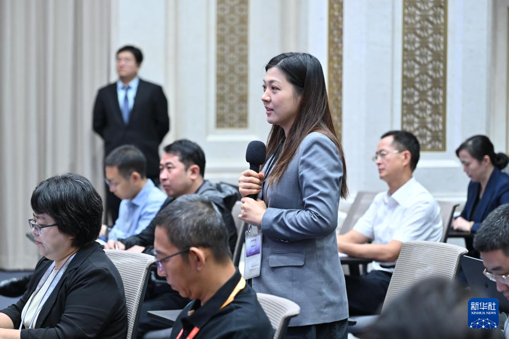 9月29日,国务院新闻办公室在北京举行“高质量完成‘十四五’规划”系列主题新闻发布会,水利部部长李国英、水利部副部长陈敏、水利部规划计划司司长张祥伟、水利部水资源管理司司长于琪洋介绍“十四五”时期水利高质量发展成就,并答记者问。这是记者在现场提问。新华社记者 李鑫 摄