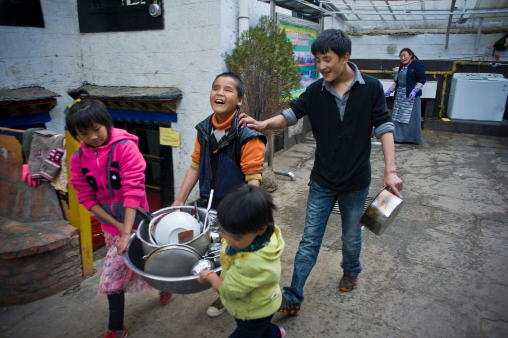 2013年10月12日,达瓦次仁(左二)跟同学们将洗好的餐具抬回厨房。