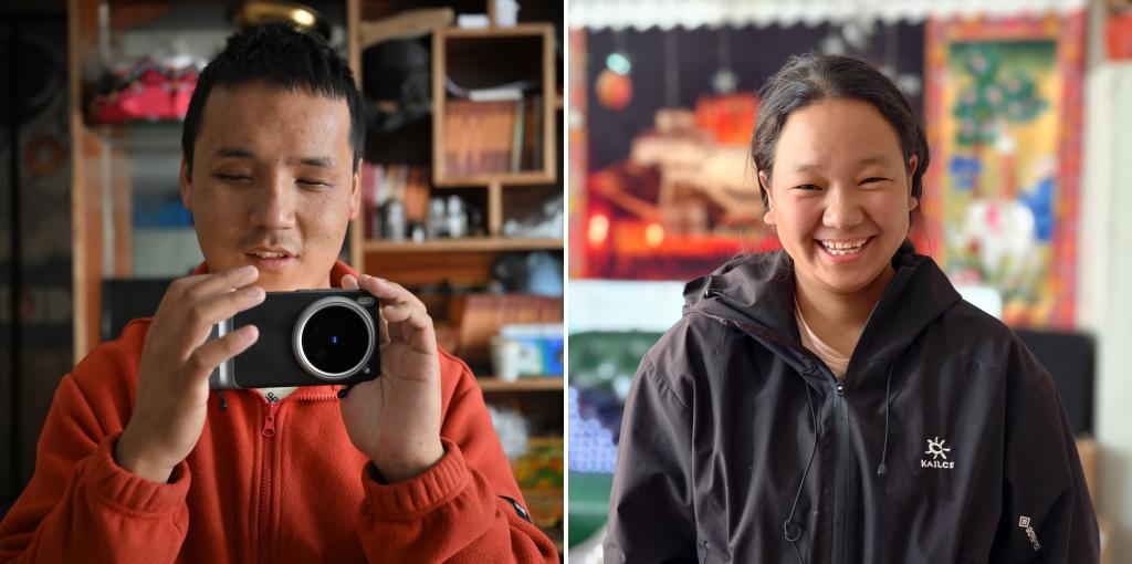 拼版照片:2025年10月10日,达瓦次仁在用手机拍照(左图);达瓦次仁拍摄的妻子朋琼(右图)。