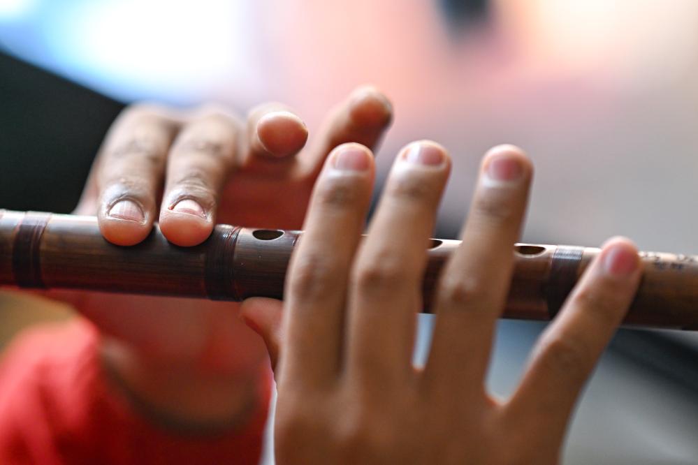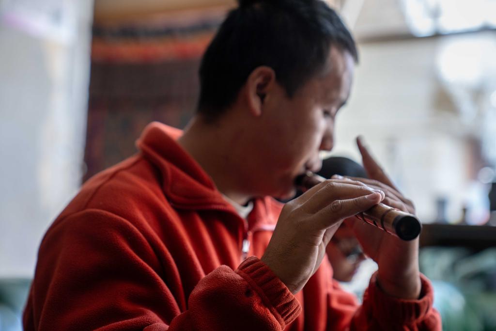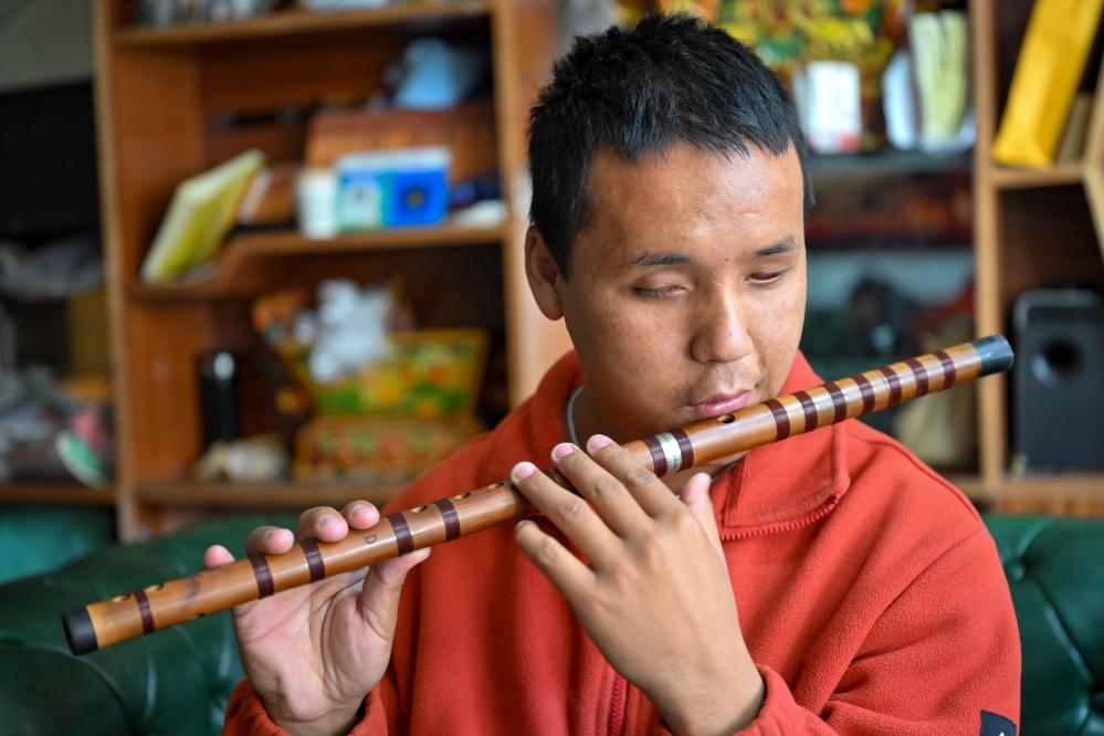 2025年10月10日,达瓦次仁在练习吹奏笛子。