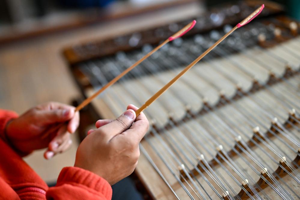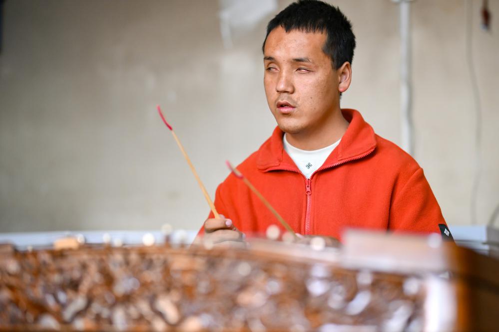 2025年10月11日,达瓦次仁在练习演奏扬琴。