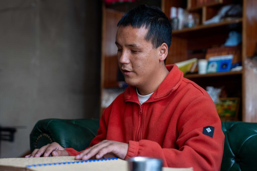 2025年10月10日,达瓦次仁在“阅读”盲文书籍。