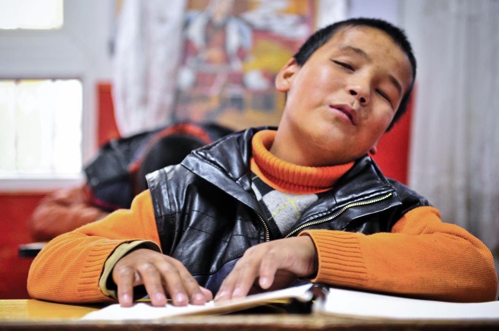 初识达瓦次仁,他是盲童学校里的“孩子王”,声音洪亮,活泼好动,脸上总挂着笑容。他藏语、汉语都很流利,还喜欢学英语,梦想着以后能成为一名英语老师。