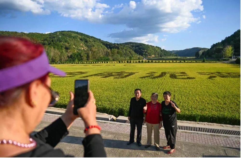 游客在南泥湾的稻田前留影。新华社记者 邹竞一 摄