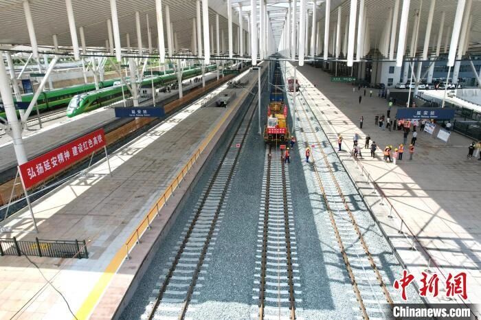 图为2025年7月1日西延高铁铺轨到达延安站。张远 摄