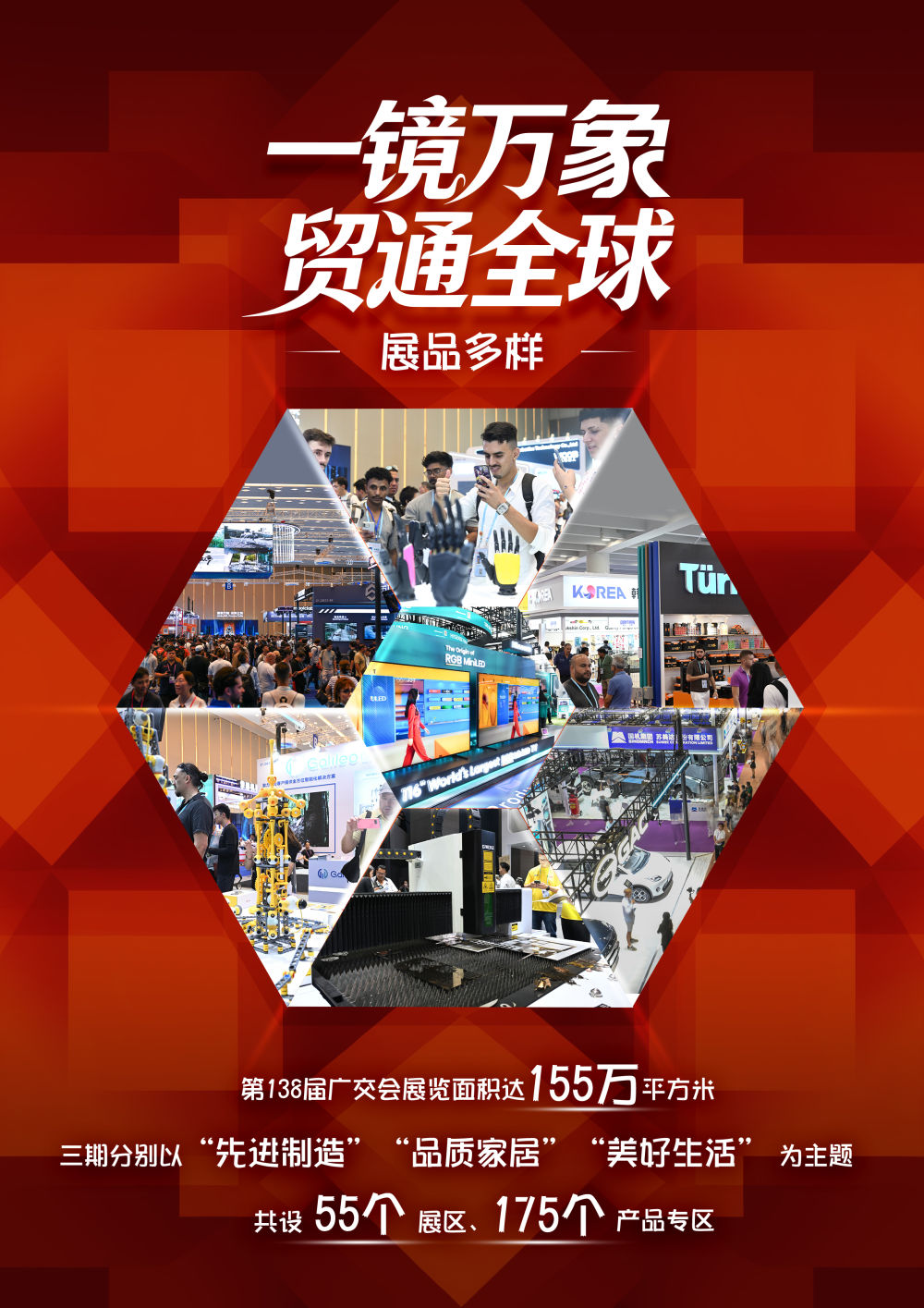 第138届广交会于10月15日至11月4日分三期在广州举办,本届广交会展览面积达155万平方米。展位总数7.46万个,参展企业超3.2万家,均创历史新高,约3600家企业首次亮相。