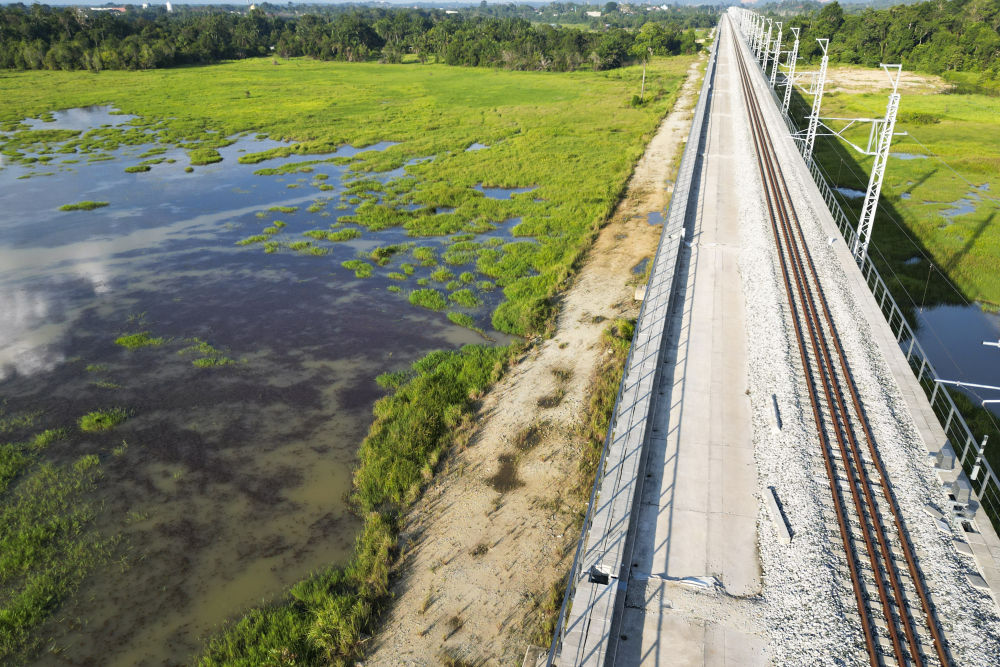 走进马来西亚彭亨州的马东铁项目建设现场,一幅人与自然和谐共生的画卷徐徐展开:笔直的铁路在茂密雨林中延伸,钢铁轨道穿越湿地秘境,数公里长的桥梁横跨原野,隧道出口处绿意盎然,盘旋的鸟儿以及嬉戏的野鸭相映成趣……一幕幕工程与自然交融的生动图景让人印象深刻。