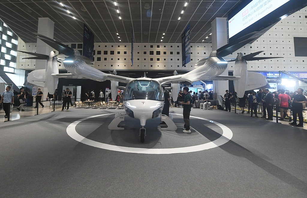 2025年7月26日,观众在2025世界人工智能大会上参观时被誉为“空中的士”的E20电动垂直起降飞行器(evtol)(图自视觉中国)