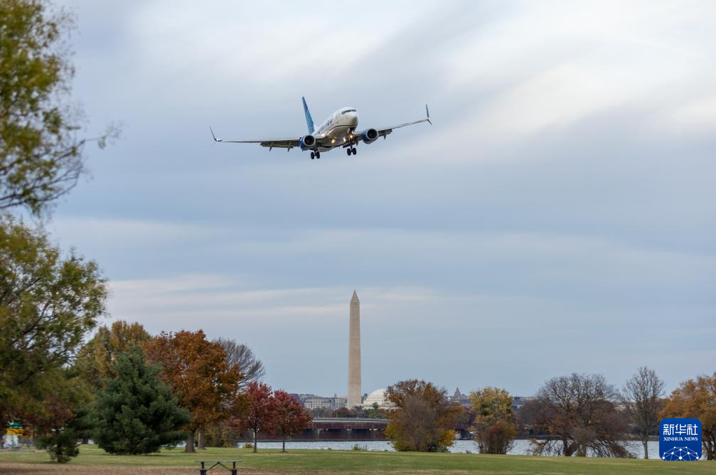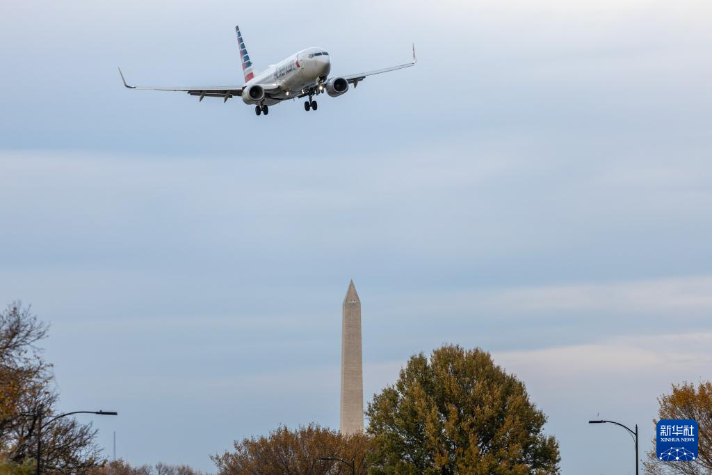 11月7日,一架美国航空公司飞机准备降落在美国弗吉尼亚州阿灵顿的里根国家机场。新华社记者 胡友松 摄