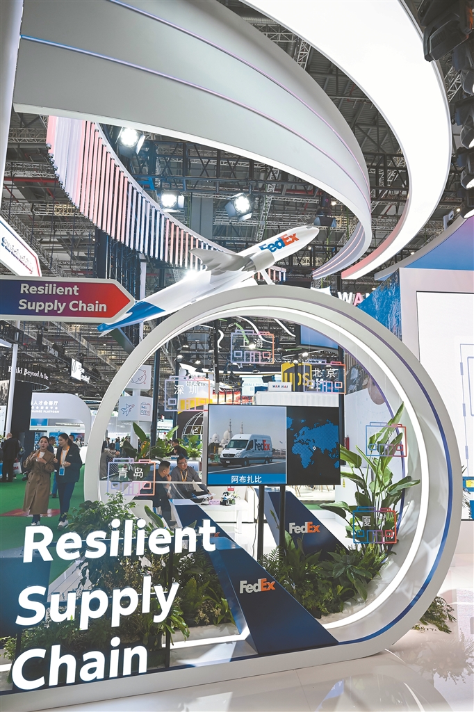 图为11月9日,人们在第八届进博会服务贸易展区联邦快递(FedEx)展台交流。新华社记者 陈浩明 摄