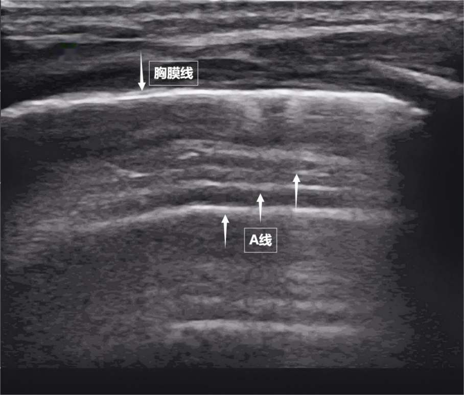 第一景:“海岸线与海浪”——胸膜线与A线当声波穿过胸壁肋骨缝隙,首先会遇到紧贴肺表面的光滑薄膜——壁层胸膜和脏层胸膜。两者紧密相贴,中间没有多余的气体或液体。它们在屏幕上呈现为一条明亮、光滑的水平线,共同构成了胸膜线。这条线就是肺的“海岸线”。在它的下方,由于肺泡内大量气体对声波的强烈反射,会出现一系列与胸膜线平行的、等间距的、重复出现的明亮平行线,像海浪般不断向屏幕深处延伸,这就是A线(见下图)。A线是正常含气肺部的典型标志。它的存在直接提示肺表面含气充足,胸膜腔内无异常积液或气体。