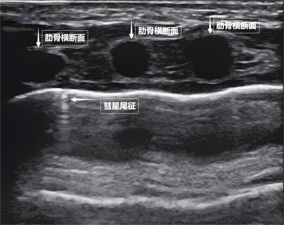 第二景:“沙滩与浪花”——肺滑动征如果我们把超声图像调成实时动态模式,把“照片”变成“电影”,更神奇的一幕出现了。随着呼吸,胸膜线会随胸廓运动轻柔滑动,这就是“肺滑动征”。它意味着肺与胸壁正紧密相依、自由顺畅地呼吸。若肺与胸壁间有气胸或胸腔积液,这种滑动会消失。有时,在胸膜线下方还会出现细小的亮白色闪烁点,称为“彗星尾征”(见下图)。其少量、孤立出现时,通常是正常肺小叶间隔的反射,无需担心。