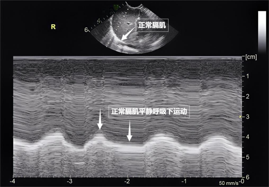 第三景:“呼吸的动力泵”的协同作战——呼吸肌肉呼吸看似简单,实则是多组肌肉精密配合的“团体操”。肺部超声不仅能观察肺的形态,更能通过实时动态影像,“捕捉”这些呼吸肌的活动状态,为评估呼吸功能提供独特视角。膈肌是呼吸肌的“总指挥”,位于胸腔与腹腔之间。平静呼吸时,膈肌收缩下沉,胸腔容积扩大,空气自然吸入;舒张时,膈肌回升,肺部弹性回缩完成呼气。超声下可见膈肌呈光滑弧形,随呼吸规律上下移动(见下图)。肋间外肌则是“肋间隙的升降机”,收缩时上提肋骨,扩大胸腔前后径,辅助吸气。这对“黄金搭档”承担了日常呼吸70%以上的工作量,是维持呼吸的“主力军”。