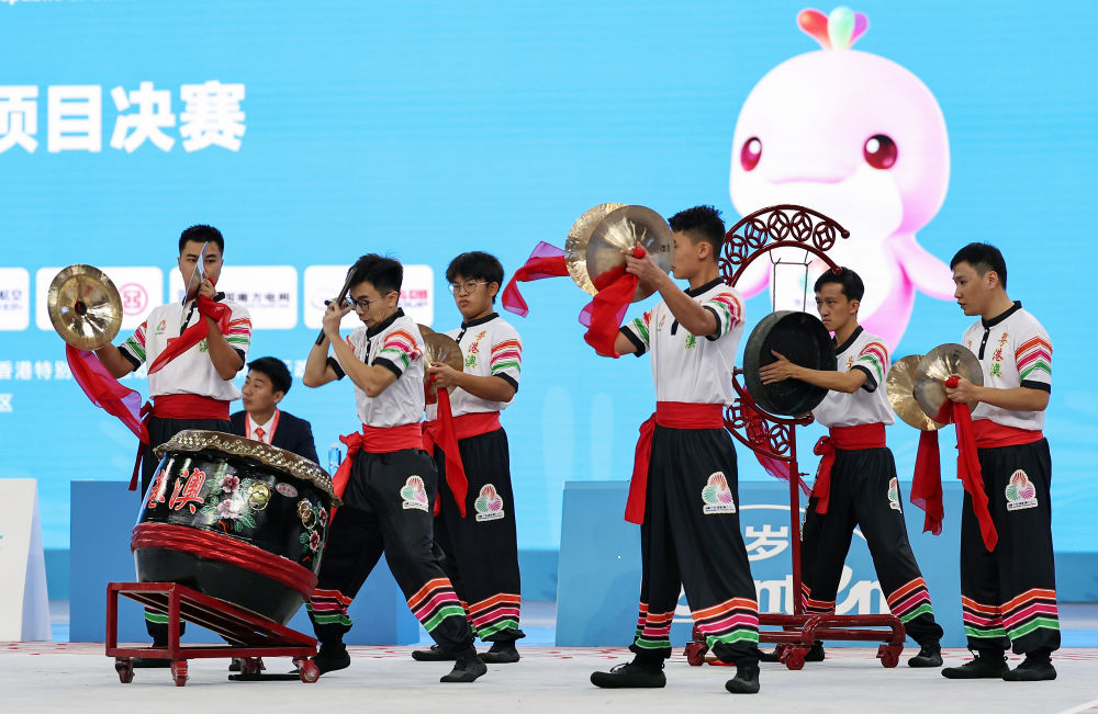 11月11日,粤港澳联队在第十五届全国运动会群众展演舞龙舞狮南狮自选项目决赛比赛中。新华社记者 王鹏 摄