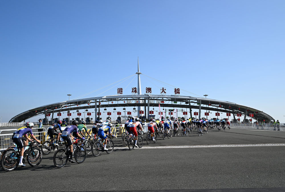 11月8日,在第十五届全国运动会公路自行车男子个人赛决赛中,参赛选手在港珠澳大桥骑行。新华社记者 梁旭 摄