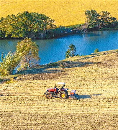 图为11月19日,农机在江苏省兴化市陈堡镇蒋庄村田间播种冬小麦。