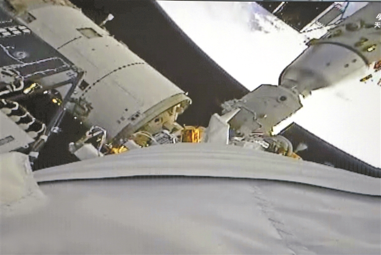 这是11月25日在北京航天飞行控制中心拍摄的神舟二十二号飞船与空间站组合体对接成功的实时画面。新华社记者 王春涛 摄