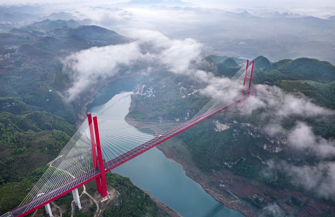 红色大桥如长虹飞架云端,疾驰的车辆穿云破雾驶向远方。