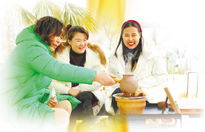 河南栾川县,游客在畔山民宿围炉煮茶。